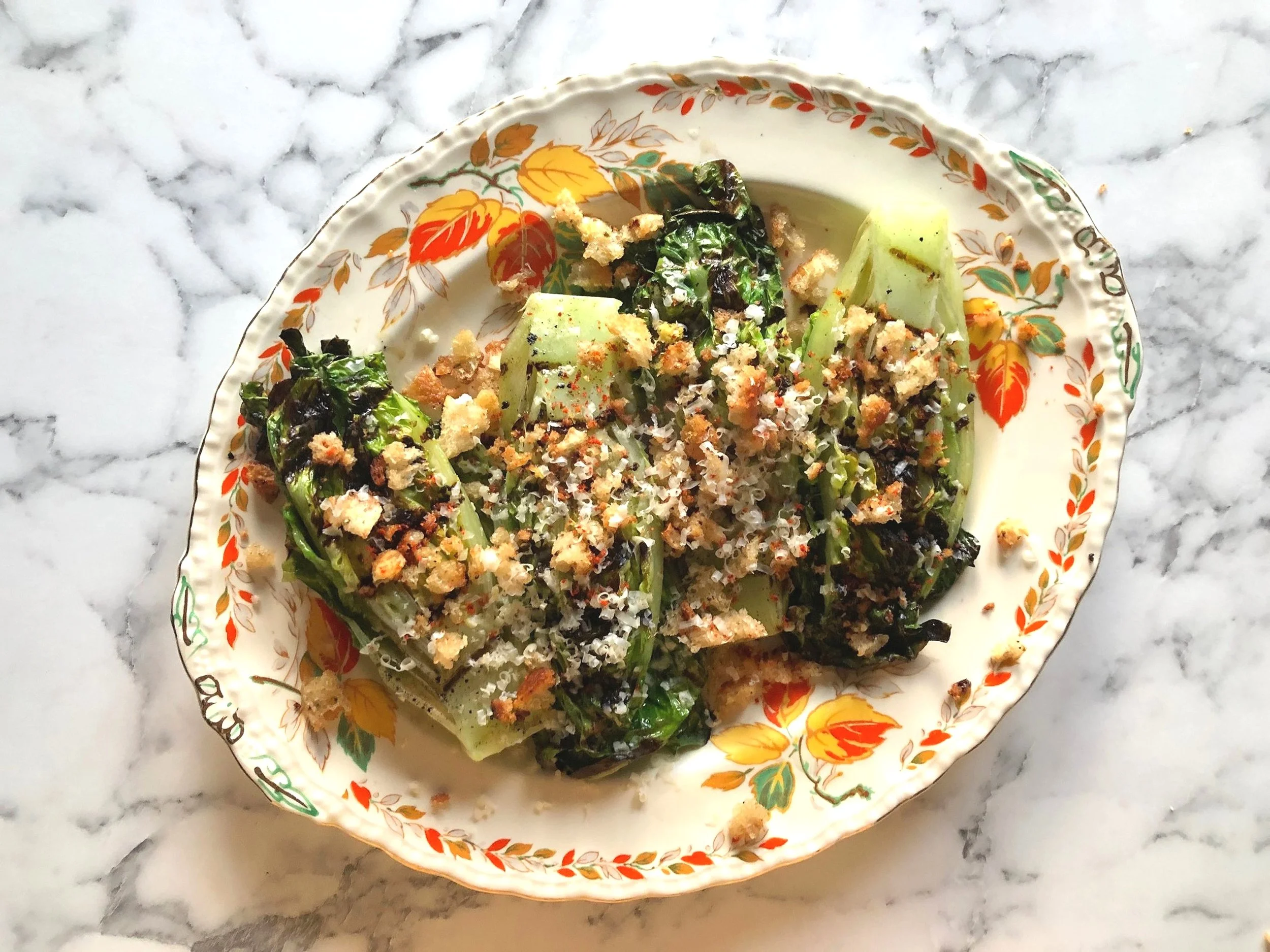 Griddled lettuce with rosemary and lemon breadcrumbs